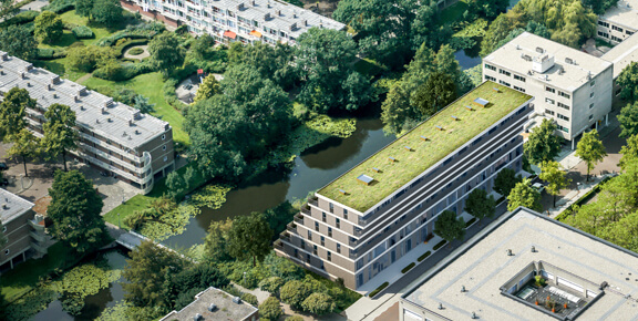 Terras Op ZUID is located on De Klencke, a tucked-away street looping off Boelelaan, on the bank of a lush watercourse. This watercourse is part of the city’s ecological network: a more or less undiscovered oasis. The building makes smart use of its location. While the northern aspect of the building faces the Zuidas and the city, the building’s southern side has a view on the green and the waterside. Terras OP ZUID functions as a link between the city and the green space.